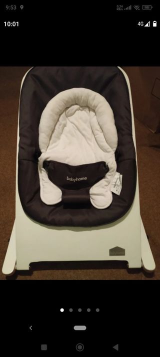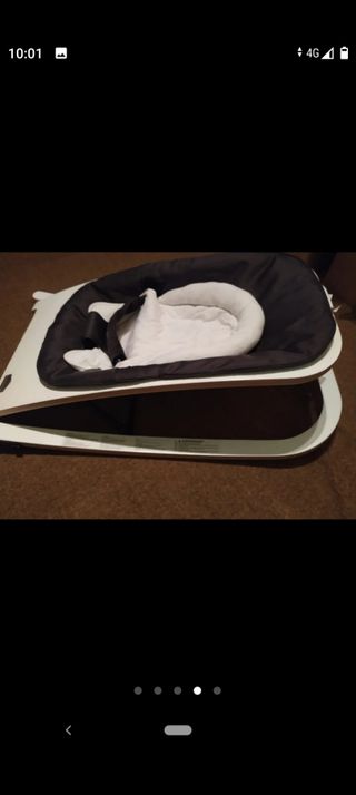 Hamaca para bebes marca babyborjn. Tiene tres niveles de tumbado y se pliega completamente ocupando muy poco espacio. Viene con la caja original y el libro de instrucciones. La funda se puede dar la vuelta y se queda sin lo de atar para cuando suban y bajen solos. El armazón está en perfecto estado y la funda tiene los colores desgastados
