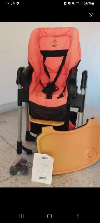 Trona para bebés de la marca Jane.. Válida desde los seis meses tiene diferentes alturas incluso el reposapieses ajustable para cuando son más mayores totalmente plegable se puede quitar y poner la bandeja y tres posiciones para tumbarle si se queda dormido - Color naranja. - Incluye bandeja. - Plegable para fácil almacenamiento.