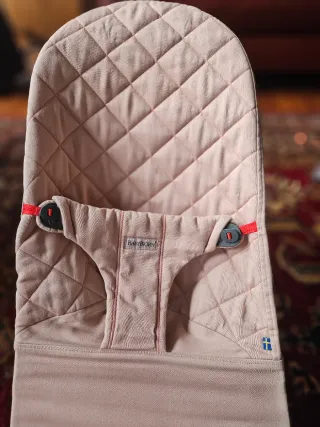 Hamaca para bebé de la marca Babybjorn. Es cómoda y ergonómica. - Diseño acolchado. - Color rosa pálido. - Incluye arnés de seguridad. - Bandera sueca en el lateral.