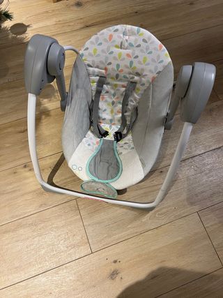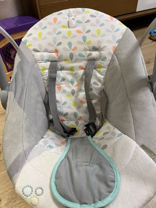 Hamaca para bebé de la marca 4moms con un diseño moderno y divertido. - Tejido acolchado con estampado de colores. - Base estable y segura. - Incluye arnés de sujeción. Se vende lo que se ve en la foto hamaca y cargador.no se rebaja