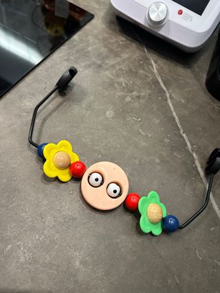 Arco de juegos amarillo con peluches para hamaca de bebé. Se sujeta fácilmente a la hamaca. - Arco de color amarillo. - Incluye tres peluches colgantes. - Dos pinzas de sujeción naranjas.