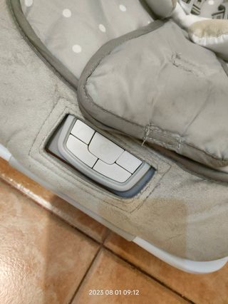 Hamaca mecedora con varias velocidades y conexión Bluetooth. - 4 velocidades de balanceo. - Conectividad Bluetooth para música. - Mando a distancia incluido. - 12 canciones - De 0 a 18kg - Arnés de 3 puntos. Nota. La hamaca esta en perfectas condiciones de funcionamiento, la pata tiene un raspón, casi sin uso.