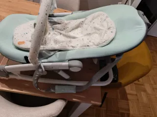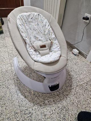 Hamaca balancín, muy poco uso, cómo nuevo. Balanceo 5 velocidades. Detector movimiento. 12 melodías y 5 sonidos de la naturaleza. Barra de juguete. Precio original 120 euros.