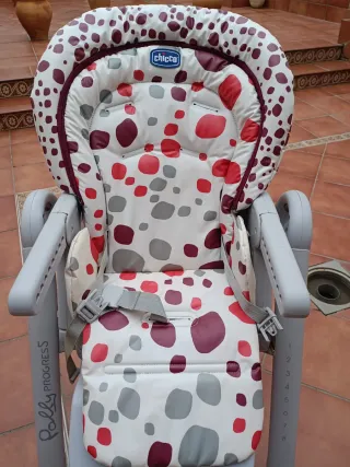 Trona plegable Chicco Polly Progress 5 con un divertido estampado de lunares en tonos burdeos, rojo y gris sobre fondo blanco. Es cómoda y fácil de guardar. - RECOGER EN PERSONA -Plegable - Asiento acolchado. - Arnés de seguridad. - Estructura resistente. -Diferentes posturas hasta hacerlo hamaca -Se puede usar desde 0 meses -Seminueva