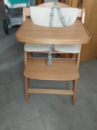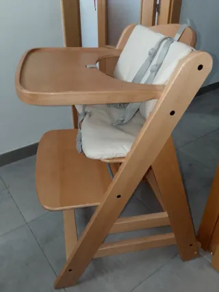 Trona de madera para bebé, ideal para las comidas. - Bandeja de madera. - Cojín acolchado. - Arnés de seguridad.