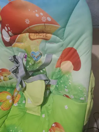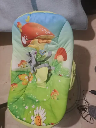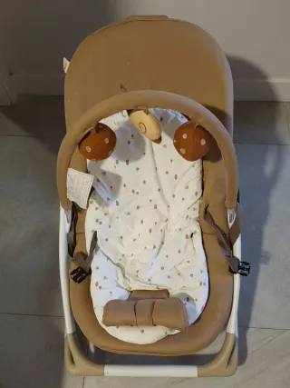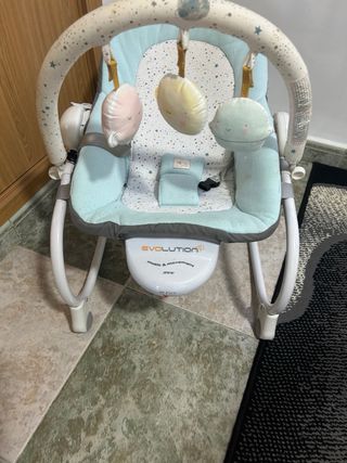 Hamaca Jané evolution. Sirve desde bebé hasta los 5 -6 años, ya que el asiento tiene varias posiciones. Está acolchado y cuenta con un arnés de seguridad. Se puede poner estático o con balanceo. Tiene sistema de música y vibración.