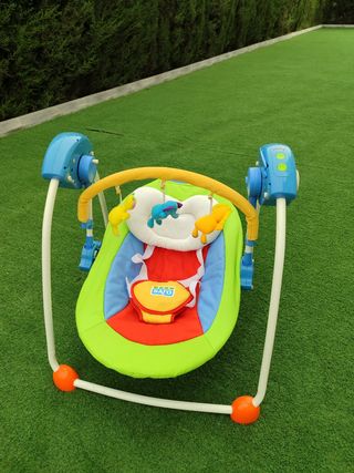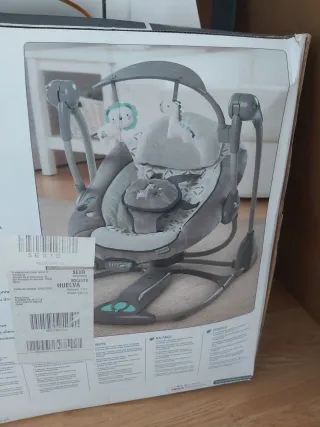 Con vibración y música. Varias posiciones de inclinación. Asas para transporte. Bolsillo trasero. Posibilidad de dejar fija o balanceo. Arnés de seguridad. Muy bien cuidada. Lavable.