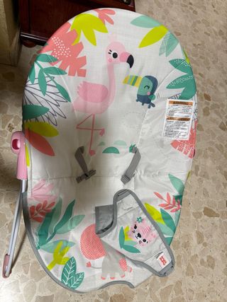 Hamaca para bebé con un diseño alegre y colorido, ideal para el entretenimiento y descanso. Tiene varias posiciones, es reclinable y además se puede poner fija para tumbarlo y dormirlo. - Arco de juegos con figuras. Incluye música y vibración. - Tejido suave y acolchado. - Estructura resistente y segura. Tiene un pequeño defecto, que se incluye en la foto: mi hija le rompió con el dedo el protector que traía en la parte posterior.