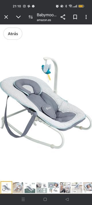 Hamaca para bebé de la marca Babymoov, muy acolchadita. El cogincite y el juguete no aparecen en la foto porque no los he utilizado nunca, siguen en su caja.