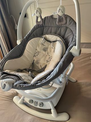 Hamaca automática para bebés en color gris con un diseño de hojas en el cojín. En perfecto estado. Se puede usar conectada a corriente o a pilas. - Con mando a distancia. - Velocidad ajustable. - 12 melodías - Cojín acolchado. - Arnés de seguridad. - Incluye juguetes colgantes.