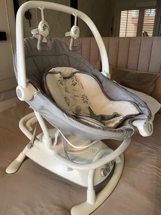Hamaca eléctrica para bebés. Usada pocas veces. - Incluye dos juguetes colgantes: una estrella y una luna. - Arnés de seguridad de 5 puntos. - Funda extraíble y lavable. - Bluetooth,mando a distancia. - Diferentes niveles de velocidad. - musical. - Con mosquitera