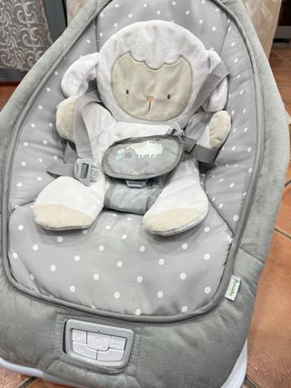 Hamaca mecedora Ingenuity con diseño de cordero. - Acolchado suave y cómodo. - Estructura gris con lunares blancos. - Colgante de peluche. - Arnés de seguridad. Perfecto estado, usado dos o tres veces no más.