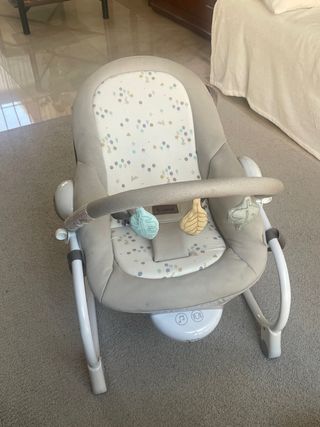 Hamaca Chicco Rhythm’n sound, tiene musica y tiene la opción de moverse sola o con el movimiento del bebe. Sin estrenar ya que compramos 2 (una para la vivienda habitual y otra para la casa de los abuelos) y una no llegamos a estrenarla (en la segunda foto se ve el precio al que la compramos)
