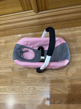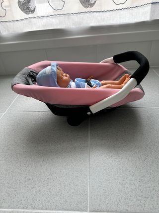 Asiento de coche, en color rosa y gris, diseñada para muñecas de hasta 46 cm. Con babero y cinturón de seguridad.Es un accesorio perfecto para jugar. También sirve como hamaca. - Asa ergonómica, puede moverse, quedando estable en tres posiciones. - muñecas no incluidas.