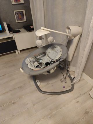 hamaca jané de bebe, usada 3 veces. Es electrica se balancea sola y tiene 5 niveles de velocidad. Va con enchufe y mando. Tiene musica. Costo 149€.