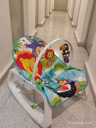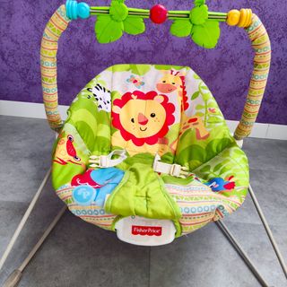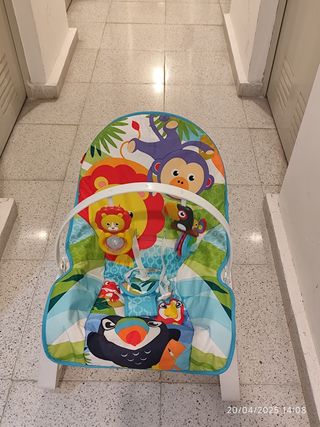 Hamaca columpio de la marca Fisher Price, en buen estado. - Diseño con temática de animales de la selva. - Incluye dos juguetes colgantes. - Arnés de seguridad.