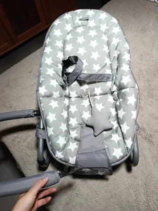 Hamaca como nueva, con muy poco uso. Tiene un cojín para la cabeza regulable en dos posiciones. Modo vibración y melodías a pilas. Cuenta con un arco desmontable con dos muñecos. Marca Bright Stars