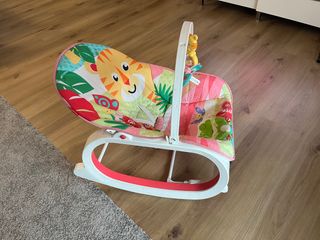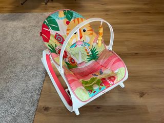 Una hamaca que el niño podrá usar hasta que llegue a los 18 kg Asiento cómodo de gran profundidad y respaldo reclinable con vibraciones relajantes que ayudan a descansar al bebé Barra de juguetes desmontable con mariposa que hace ruiditos y pelotita de tigre Patas desplegables para convertirla en hamaca fija Acolchado lavable a máquina, almohadilla rosa Marca fisher price.