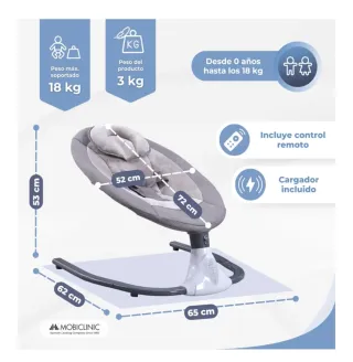 Hamaca para bebé, ideal para el descanso y entretenimiento. - Color gris. - Arnés de seguridad. - Musica. -4 velocidases. -Opción bloqueo movimiento