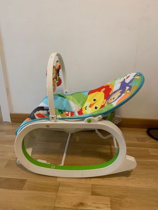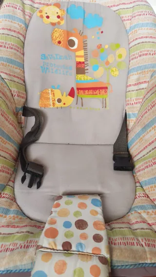 Hamaca para bebé de la marca Jané, modelo Evolution. Está usada pero todavía tiene mucha vida por delante. Ofrece distintas posiciones de respaldo y reposapies para adaptarse a las etapas de crecimiento del bebé. Dispone de un modo vibración y de melodías (se entrega sin pilas). - Diseño con estampado de animales. - Cinturón de seguridad. - Asa de transporte. - Tapizado acolchado y extraíble.