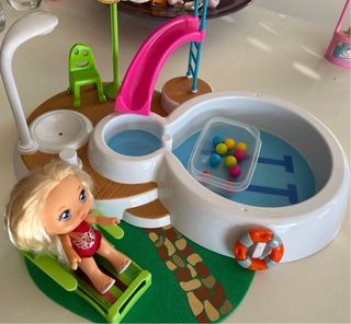 Divertida piscina de la marca Barriguitas, perfecta para jugar. - Incluye tobogán rosa. - Hamaca verde. - Silla verde con cara sonriente. - Salvavidas naranja. - Bolas de colores.