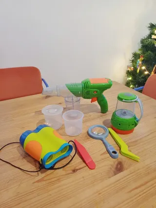 Kit de explorador para niños con varios accesorios para la aventura. Tan solo el aspirador de insectos me costó 30€ - Prismáticos de colores. - Aspirador de insectos! - Lupa. - Pinzas. - Linterna. - Recipientes.