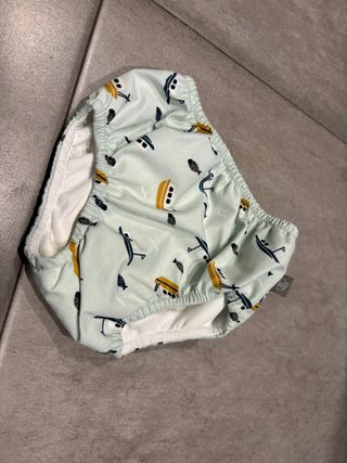 Bañador pañal para bebé con un divertido estampado. - Diseño con barcos y peces. - Tejido ligero y cómodo. - Talla 3/6 meses. - Ideal para piscina. Muy poco uso, primeros baños.