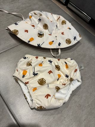 Conjunto de bañador y sombrero para bebé con un divertido estampado. - Diseño con piñas y hojas tropicales. - Talla 3/6 meses. - Muy poco uso, primeros baños.
