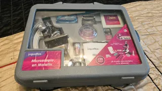 Set de microscopio Juguettos en maletín. - Incluye microscopio, manual y accesorios. - Contiene 5 placas con muestras y 7 placas vacías. - Ampliaciones: 100x, 400x, 900x. - Apto para mayores de 8 años.