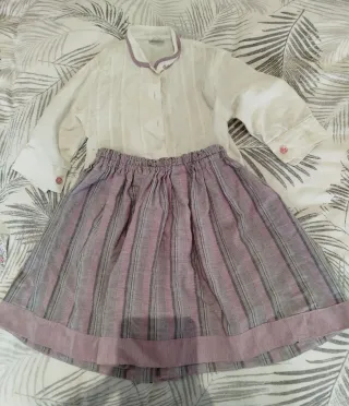 Conjunto de casera para niña, compuesto por camisa, falda, pañuelo y delantal. - Blusa blanca con detalles de puntadas verticales y cuello mao. - Falda a rayas en tonos lila y gris con cinturilla elástica. - Mangas largas con puños abotonados. - Botones frontales en la blusa. Talla de 0 a 2 años