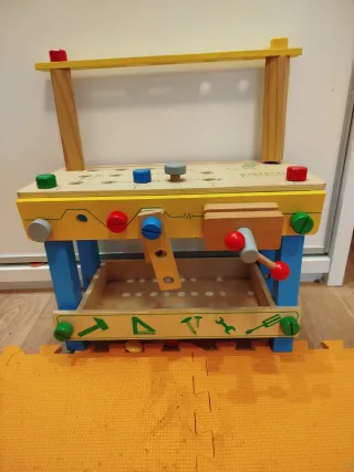 Divertida mesa de trabajo de juguete para los más pequeños, fabricada en madera. - Cuenta con un torno de juguete. - Dispone de un cajón para guardar las piezas. - Diseño colorido con detalles de herramientas grabadas.