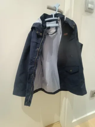 Chaqueta de niño en color azul marino. Ideal para el entretiempo. - Cierre de cremallera. - Bolsillos frontales con solapa. - Capucha integrada. - Detalle de etiqueta en el pecho.