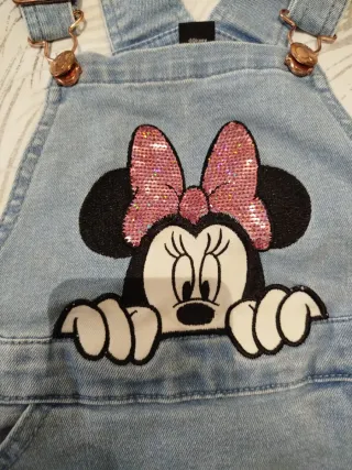 Vestido tipo peto vaquero para niña con diseño de Minnie Mouse. - Estampado de Minnie Mouse con lazo de lentejuelas. - Bordado Minnie Mouse con flores. - Bolsillos delanteros. - Tirantes ajustables.