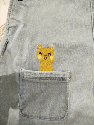 Vestido peto vaquero para niña con un divertido diseño. - Color azul claro. - Detalle de osito bordado en el bolsillo. - Tres flores bordadas en la parte superior. - Tirantes ajustables con botones.