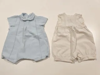Conjunto de dos prendas para bebé de 6 meses. - Una prenda azul con cuello Peter Pan. - Una prenda blanca con detalles de encaje en los hombros.