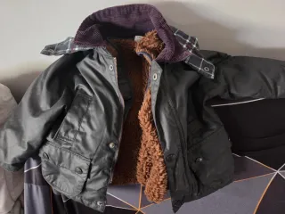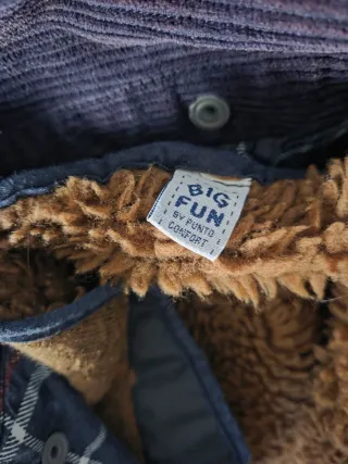 Chaquetón para bebé con un diseño clásico y cálido. Además es bastante grande, el mio lo uso hasta los 3 años - Exterior impermeable. - Forro interior de borreguito marrón. - Cuello de pana morado. - Bolsillos frontales con solapa y botones.