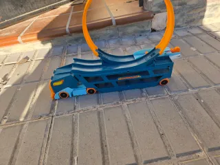 Camión de juguete Hot Wheels con una pista de bucle naranja. - Diseño de camión transportador. - Pista de bucle integrada. - Ruedas de color naranja.