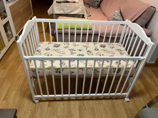 Cuna de bebé blanca, ideal para el descanso del recién nacido. Su diseño clásico se adapta a cualquier habitación. - Estructura de madera lacada en blanco. - Barreras de seguridad. - Ruedas para facilitar el movimiento. También sumier se le puede poner a dos alturas, poco uso, el retoño azul.