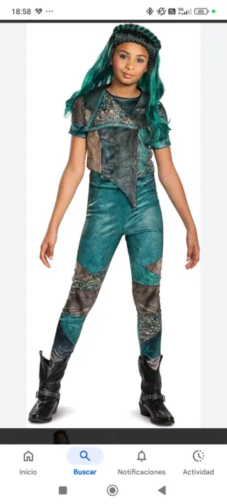 Disfraz inspirado en los personajes de Los Descendientes. Talla 9-10 - Diseño detallado con múltiples texturas. - Pantalones ajustados con parches. - Chaqueta con superposiciones. - Botas estilo cowboy con tachuelas.