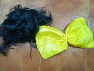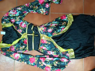 Disfraz con estampado floral inspirado en el kimono japonés. Talla 8-10 - Mangas largas acampanadas. - Detalles dorados. - Tejido ligero. Lazo para espalda y peluca