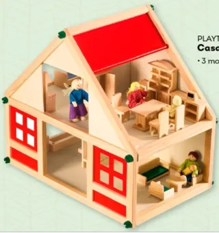 Casa de muñecas de madera con mobiliario y figuras. - Estructura de madera natural. - Techo rojo. - Incluye muebles de comedor, sala y figuras. - Ventanas rojas. - ideal entre 4-9 años - juego simbólico
