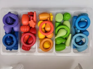 Set de bloques de construcción de madera estilo Waldorf, ideales para el desarrollo creativo. - Piezas de madera de alta calidad. - Colores vibrantes: morado, naranja, rojo, verde y azul. - Diseños variados para infinitas combinaciones.