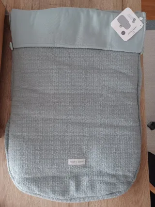 Saco de tejido texturizado en color gris verdoso, ideal para carritos de bebé. Presenta un suave acabado superior. Producto sin estrenar con etiqueta. Nunca usado. Precio PVP 120 € - Tejido exterior con textura. - Parte superior en tejido liso. - Etiqueta de la marca 'pasito a pasito'.