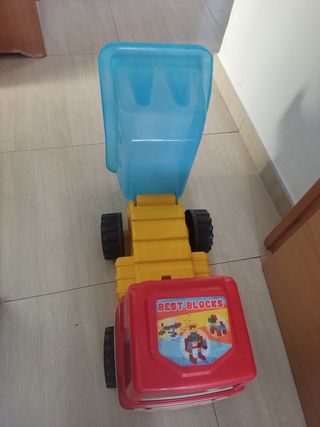 Camión de juguete con volquete azul y detalles en rojo y amarillo. Perfecto para jugar. - Volquete de plástico azul. - Cabina roja. - Ruedas negras con detalles amarillos.