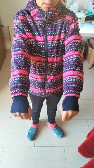 Chaqueta infantil con un diseño colorido y moderno. - Estampado geométrico en tonos rosas y azules. - Cierre de cremallera frontal. - Capucha integrada.