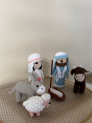 Conjunto de figuras de crochet para un belén navideño. - Incluye figuras de María, José, el niño Jesús en su cuna, un burro, un cordero y un buey. - Diseños hechos a mano con hilo de algodón. - Tonos blancos, rosas, azules y marrones. El Belén tiene una altura de 14 cm. Y tiene un precio de 35€.