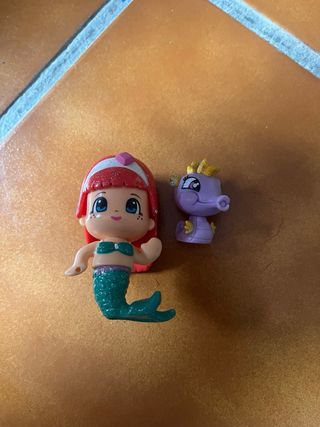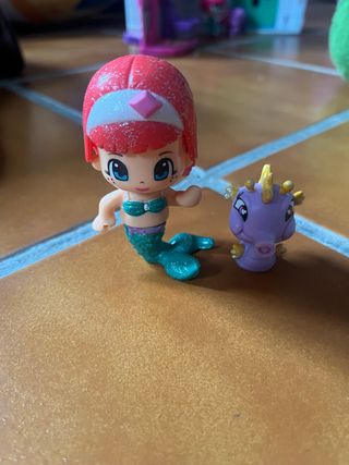 Figura de sirena Pinipon con su compañero caballito de mar. - Sirena con cola brillante. - Diadema con detalle de diamante. - Caballito de mar morado con detalles dorados.