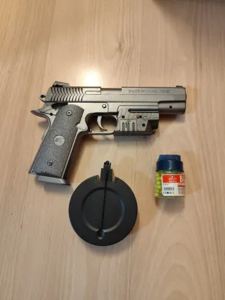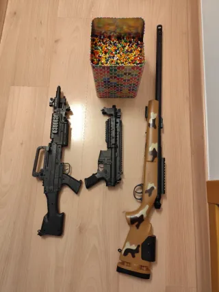 Se venden 4 pistolas de bolas, 2 de color negro 1 gris y otra con camuflaje. Incluyen cientos de bolas de colores para jugar. - 2 Pistolas negras con asa. - Pistola de camuflaje con mira. - Pistola Gris - Bote lleno de bolas de colores.