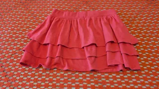 Conjunto de ropa para niña de la marca Tuctuc, talla 8 años. Incluye una falda rosa y un vestido a rayas verdes y blancas. - Falda rosa con volantes. - Vestido con tirantes y detalle de flor.