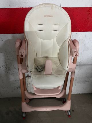 Trona Peg Perego en color crema y detalles en rosa. Ideal para las comidas de los más pequeños. - Asiento acolchado (se ha despellejado un poco del uso) y arnes. - Regulable en altura con ruedas y freno - Bandeja doble extraíble. Precio algo negociable.